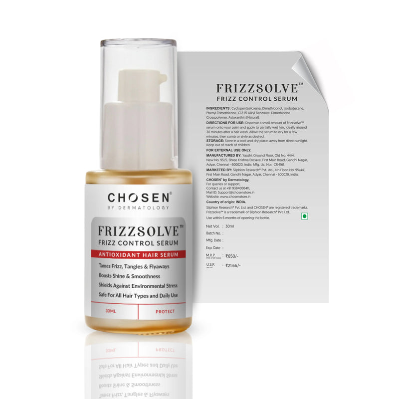 Frizzsolve and Child’s Play are both crafted with the same CHOSEN philosophy of safe, effective, EDC compliant care, but they’re designed for different needs. Child’s Play hair serum is a gentle, biocompatible detangling formula created for young scalps and sensitive users. It gives light frizz control and a naturally flowing finish. Frizzsolve, on the other hand, is a completely new formulation, designed to control frizz in tropical and humid conditions. It’s built for adult hair challenges like frizz, humidity, and sun exposure, combining a high grade silicone complex with antioxidant defense powered by Astaxanthin. Both are dermatologist formulated and safe, but Frizzsolve offers advanced, targeted frizz protection, while Child’s Play focuses on everyday smoothness and gentle care.