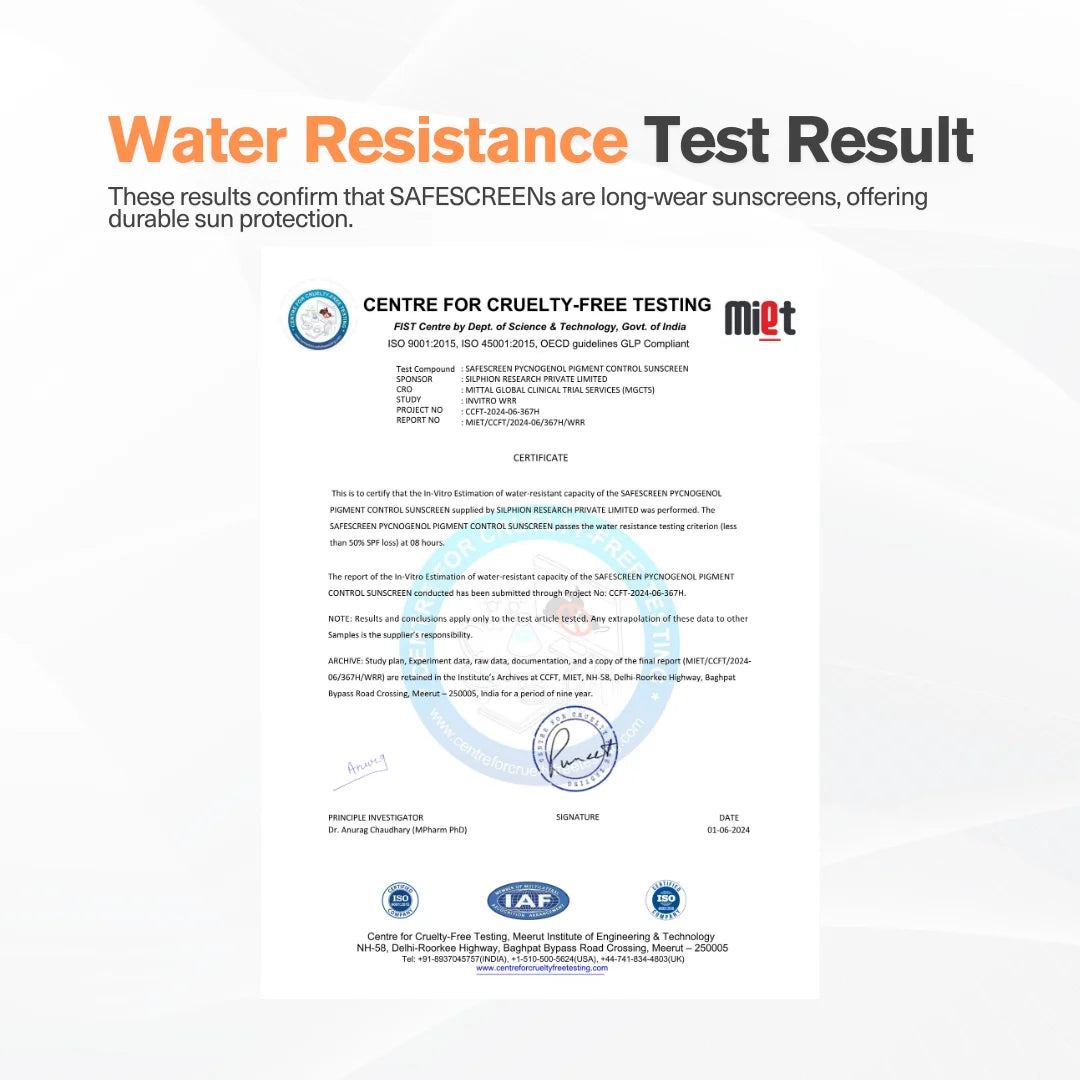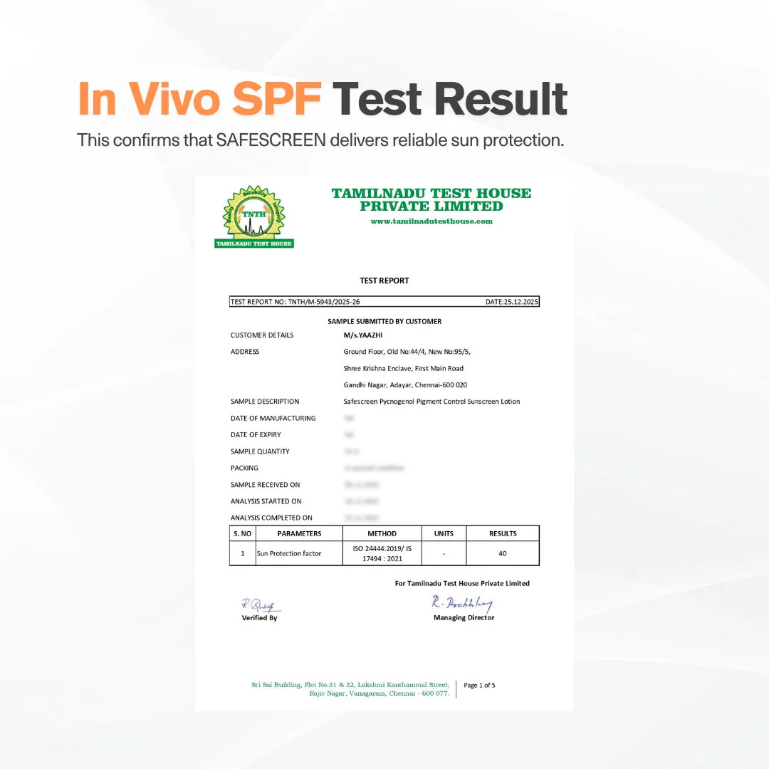 SAFESCREEN Pycnogenol has a lightweight lotion consistency that blends smoothly without feeling heavy or greasy. It leaves a sheer, natural finish with minimal to no white cast on most Indian skin tones.
