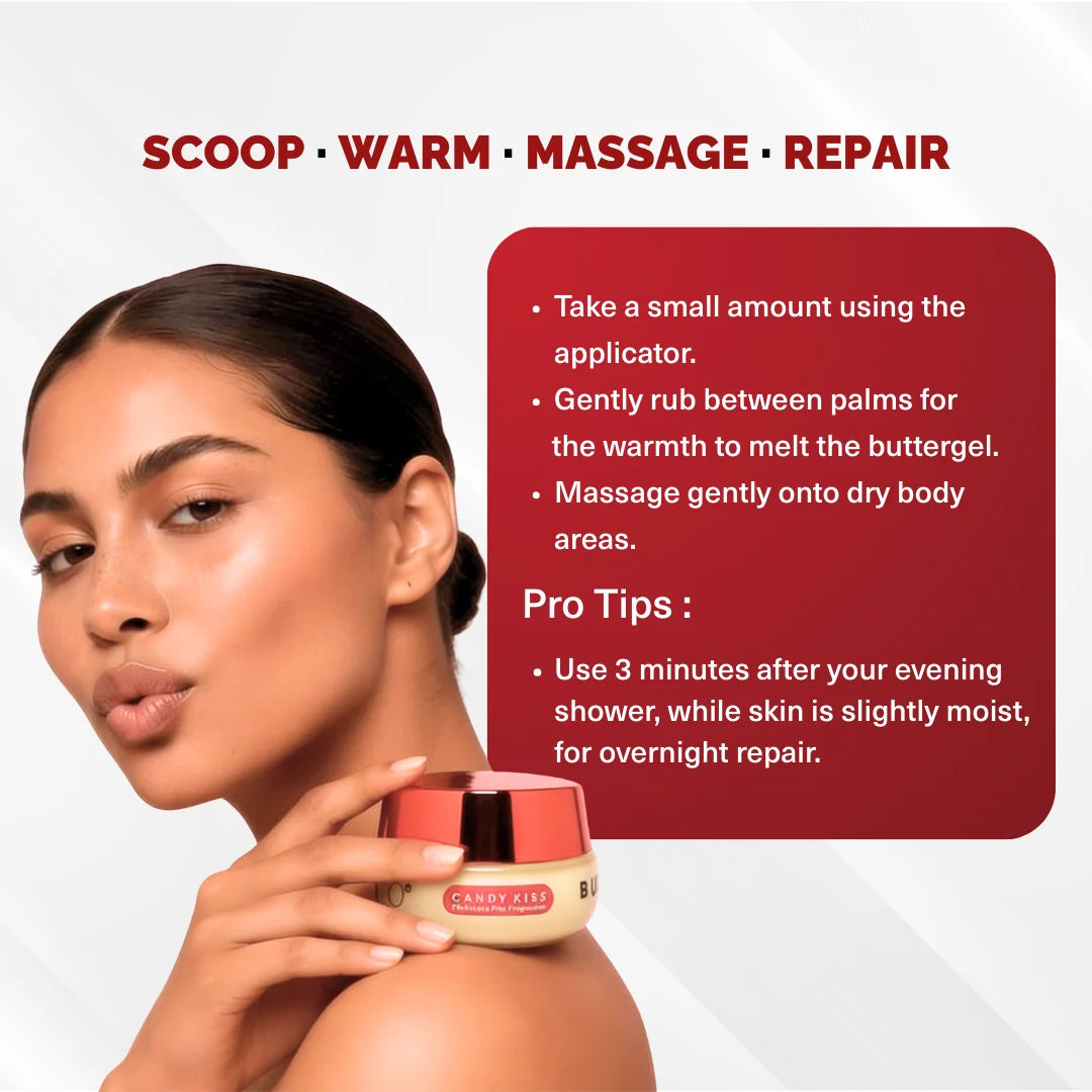 That said, you can safely use it on areas that need intense moisture, like elbows, knees, heels, or any persistently dry patches. Think of Candy Kiss as your SOS repair butter for body areas with stubborn dryness.