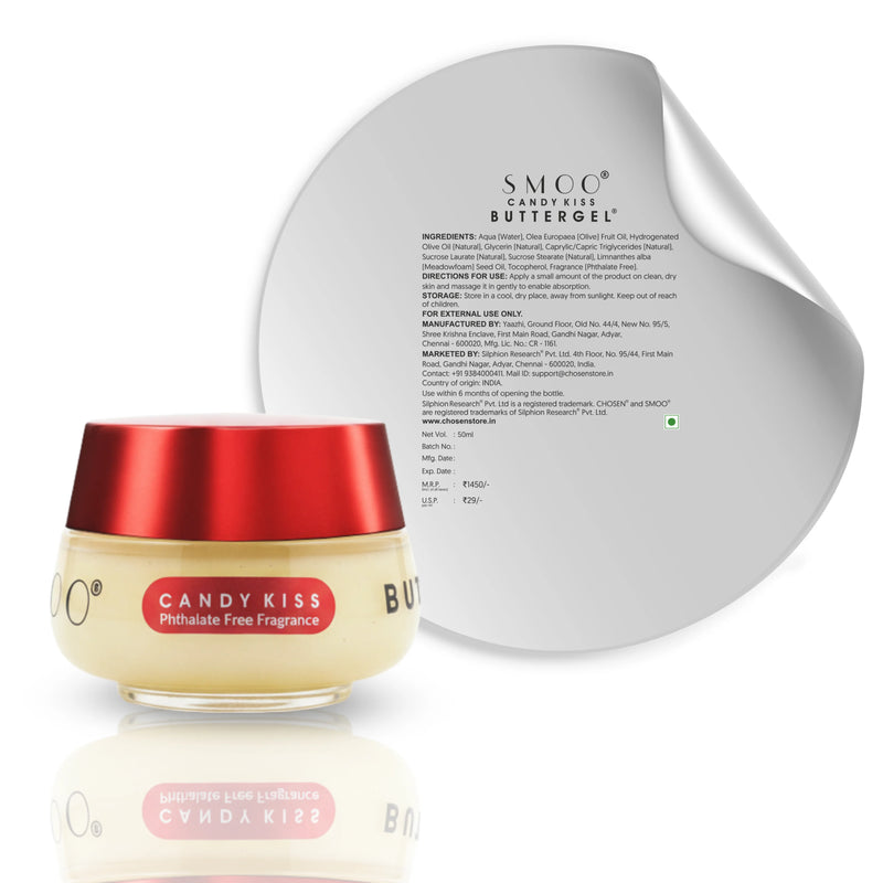 SMOO Candy Kiss Buttergel is based on the same trusted Buttergel formula, but refined for adult body care. It delivers the same deep, cushiony hydration, with the addition of a subtle, sophisticated, phthalate free fragrance that turns moisturizing into a more sensorial, spa like ritual.